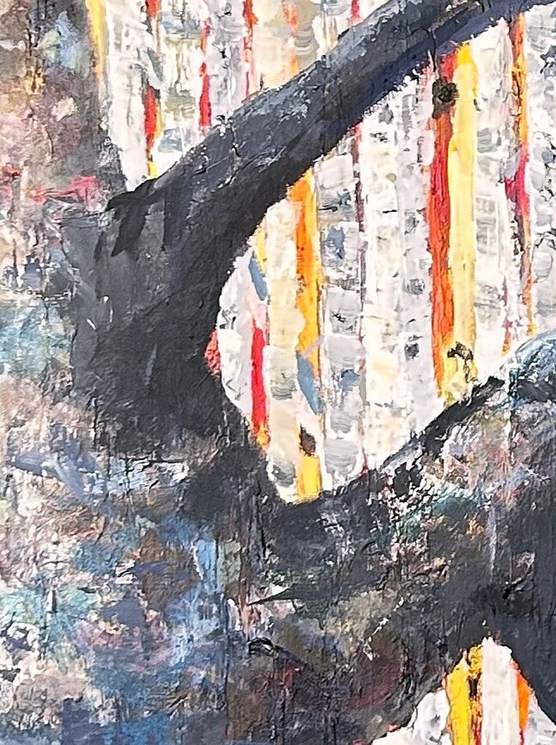 I didn’t know this at first, but ancient Oaks are known to withstand the heat of fire with their thick, layered bark and their deep root systems. In this painting, the ancient Oak stands for endurance — surviving what should have destroyed it. The White Birch is not as fortunate, as it will not survive the heat. However, its strength lies elsewhere: Birch are seed-driven, often dominating early after a fire with new growth. The Birch represents new beginnings and renewal. Lastly, the lonely Bluebird lifts itself from the smoke and ashes, finding a way forward — a moment of hope, escape, and survival. Together, they tell a story not of destruction, but of persistence through time.