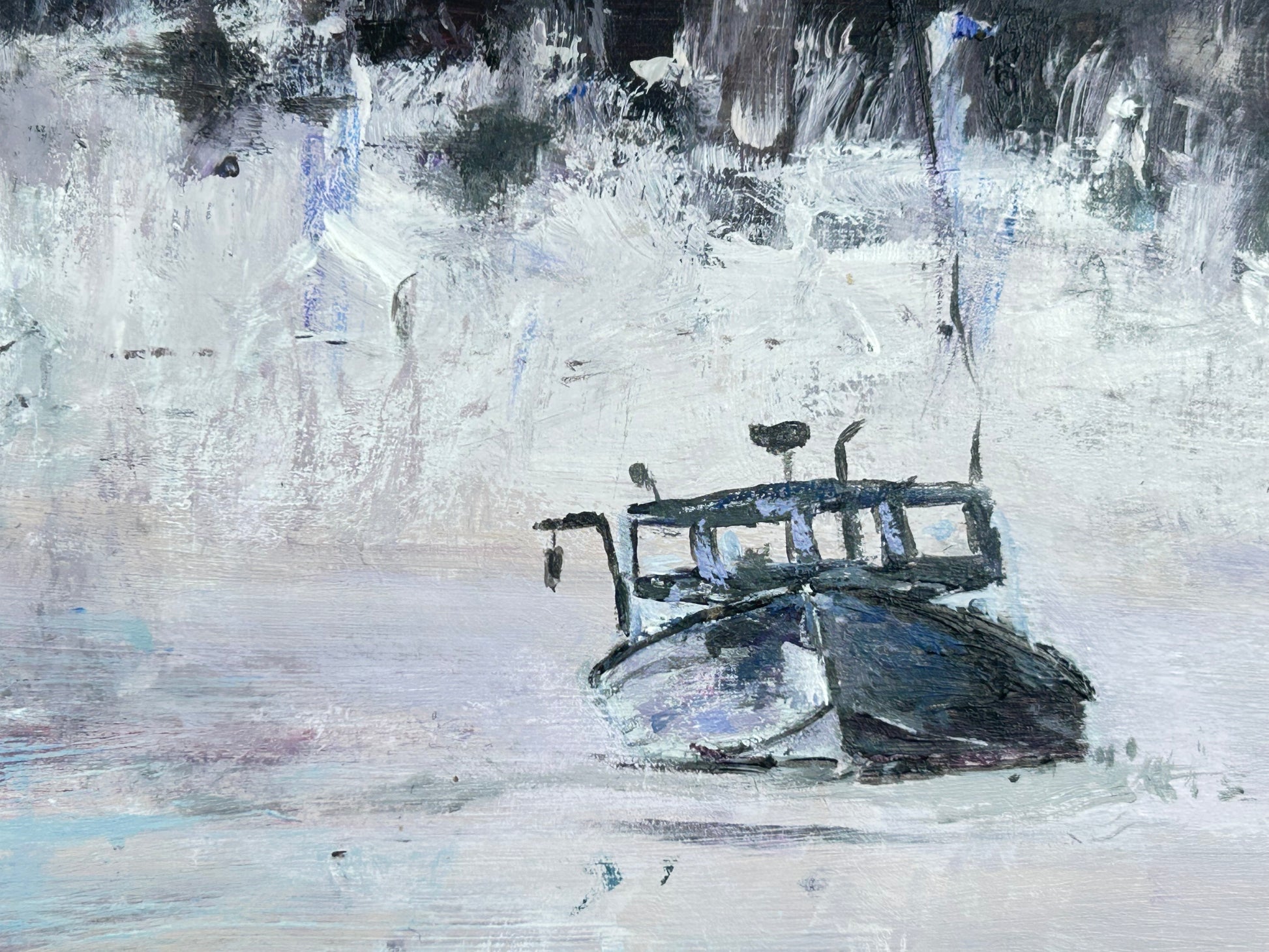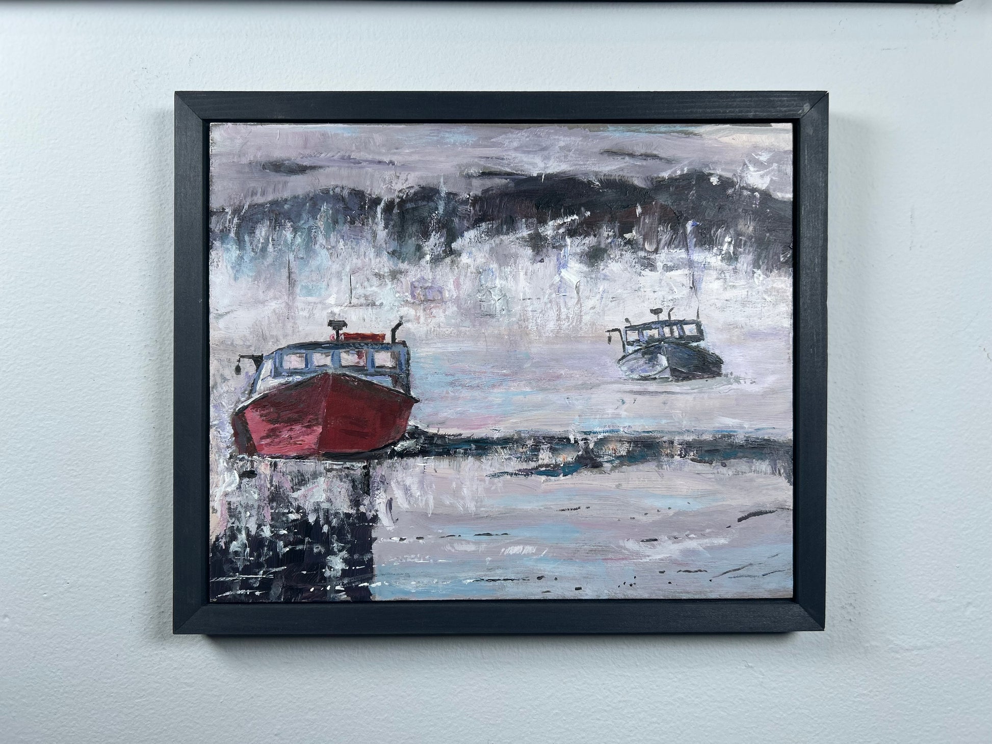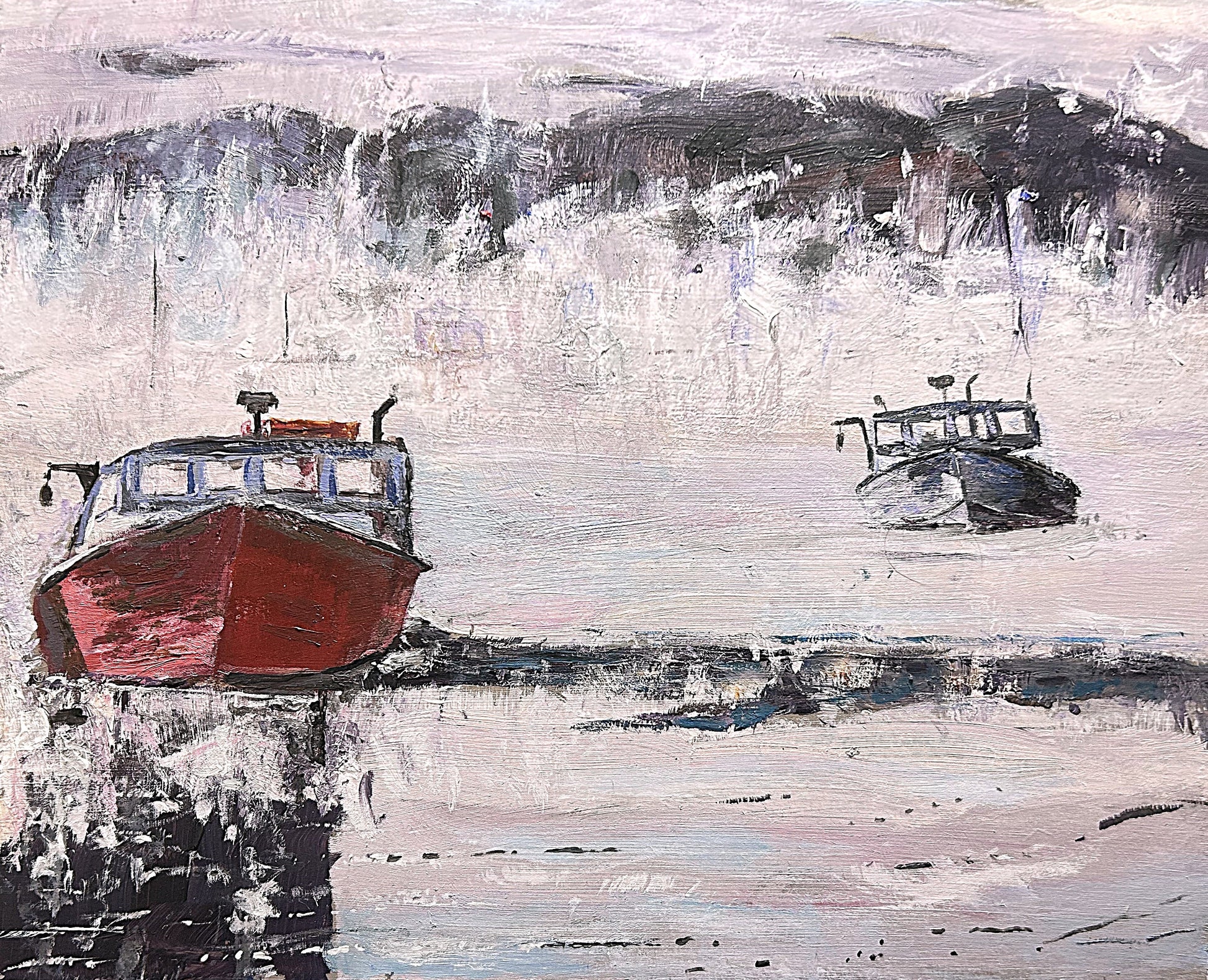 Fishing boats floating playfully through the brisk morning mist in Boothbay ME.