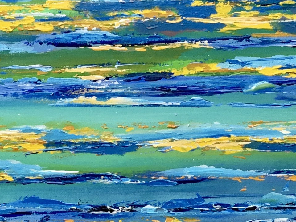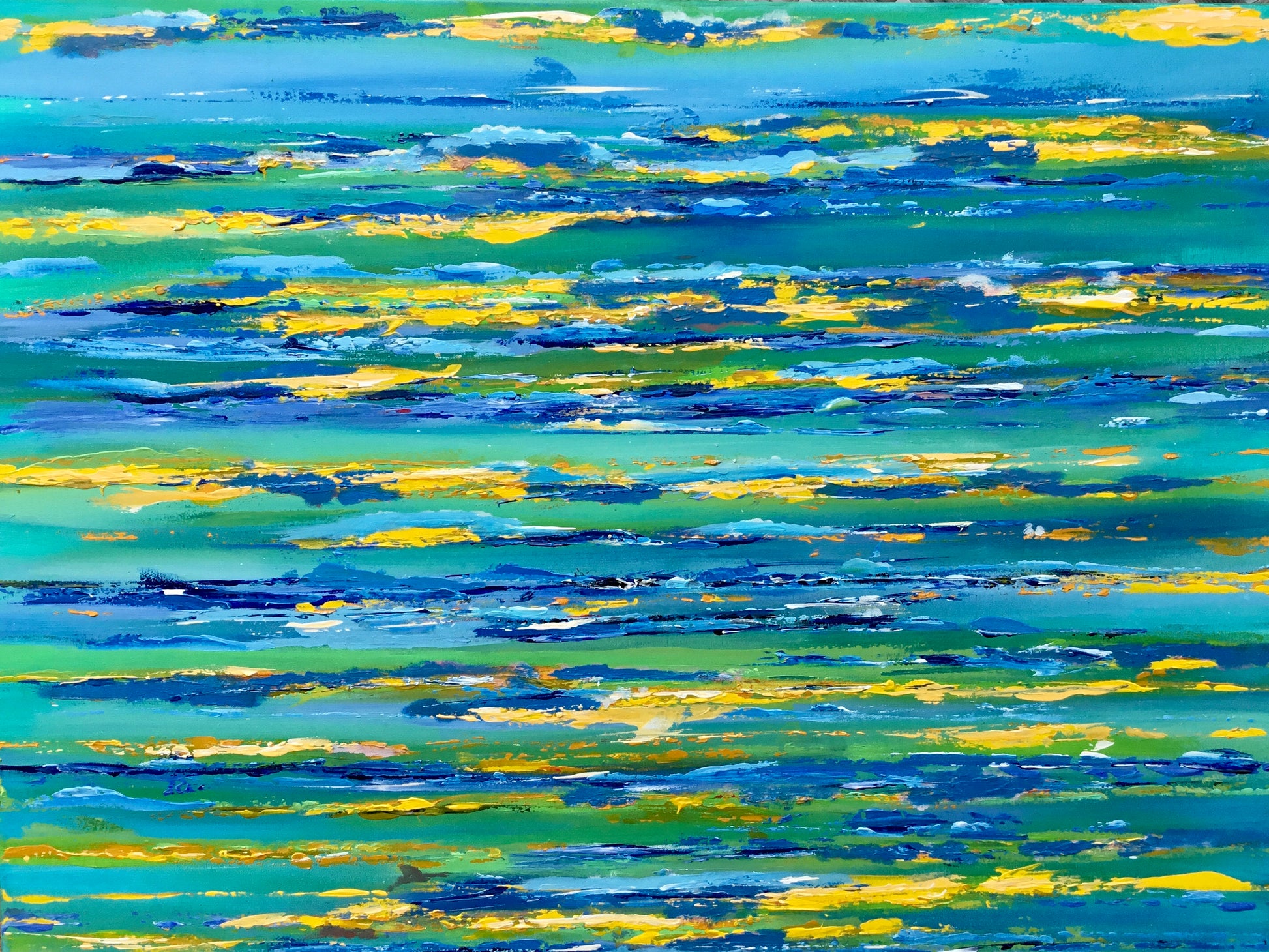 This painting reflects the natural elements of the sky, oceans, and earth in a way that evokes harmony between these forces.